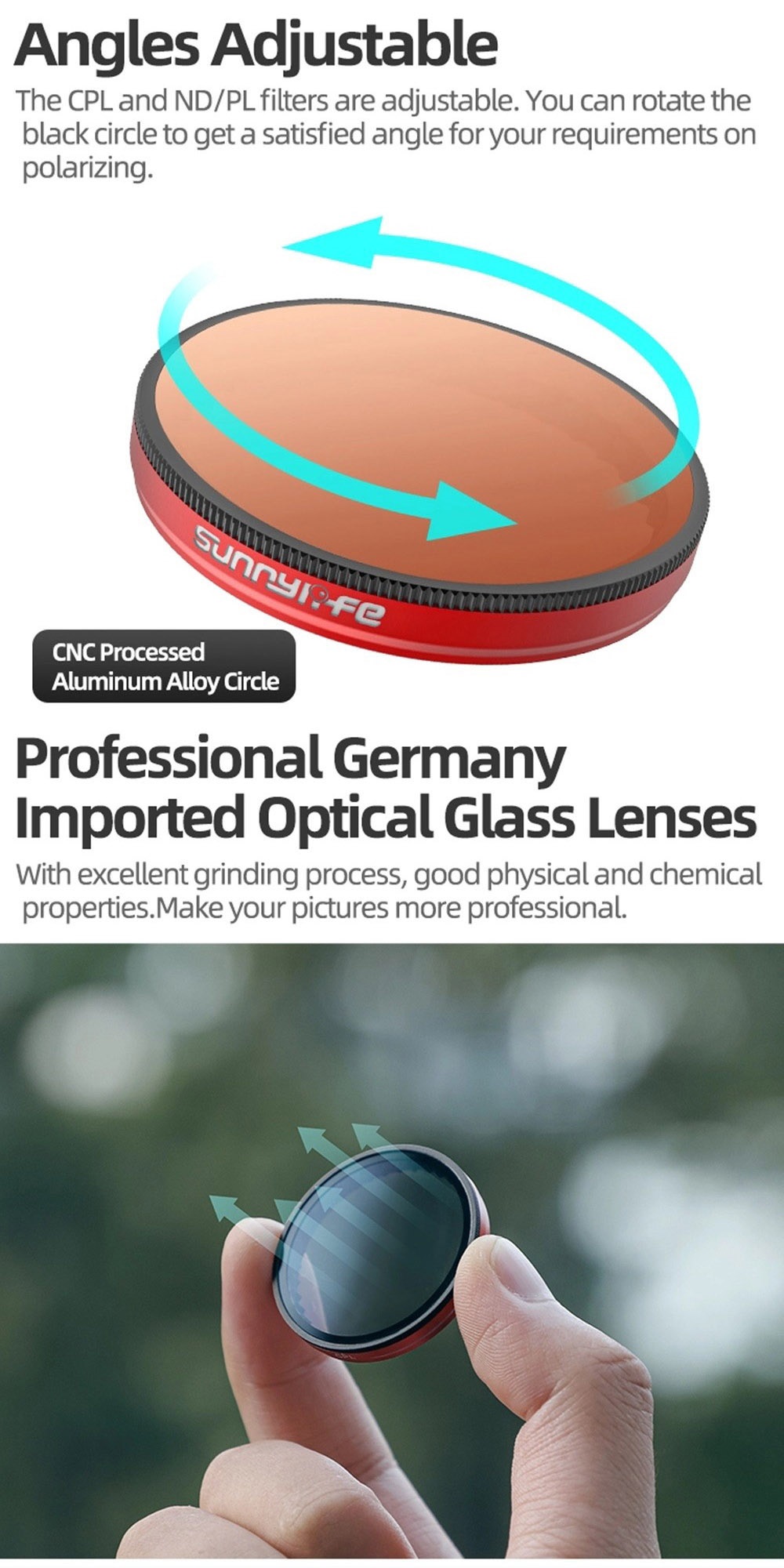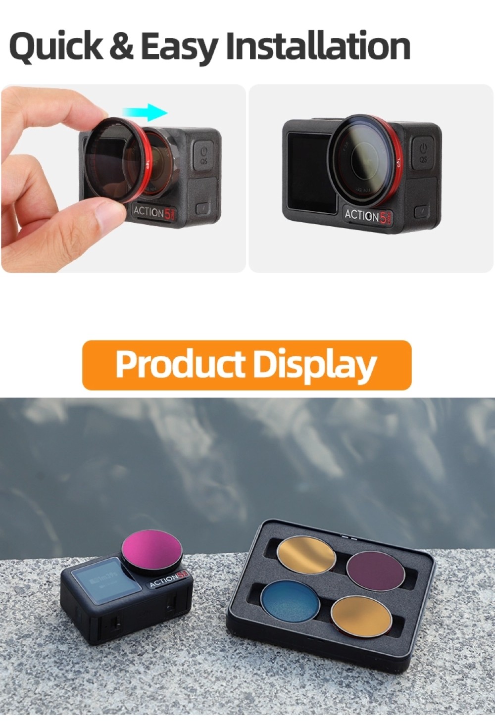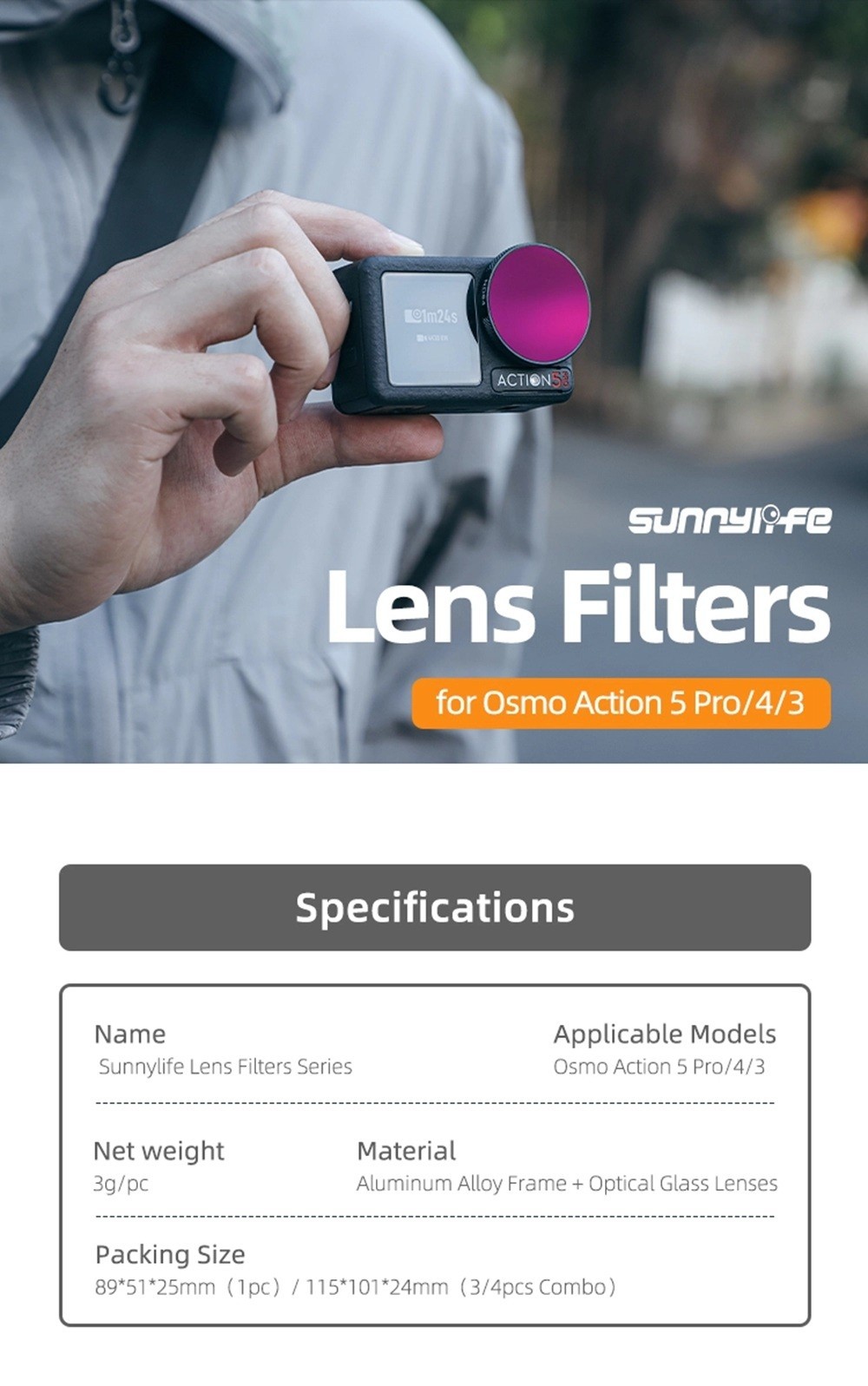 Enhance your DJI Osmo Action 5 / 4 / 3’s capabilities with the Sunnylife Aluminum Filter Kit, featuring MCUV, ND8, ND16, ND32, and ND64 filters. The kit uses premium optical glass in a lightweight aluminum alloy frame that’s corrosion-resistant and durable. Rotate or swap filters easily to control light, reduce glare, and achieve cinematic exposure under diverse lighting conditions. Ideal for action, travel, and professional creators.