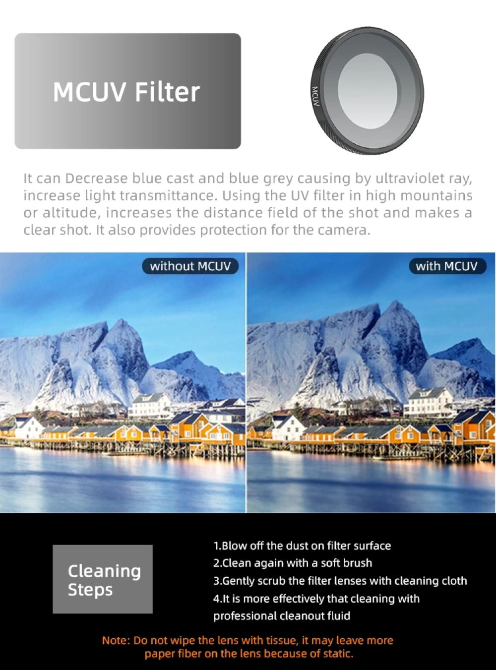 Lens protection: MCUV filter safeguards the camera lens from dust, scratches, and UV rays.