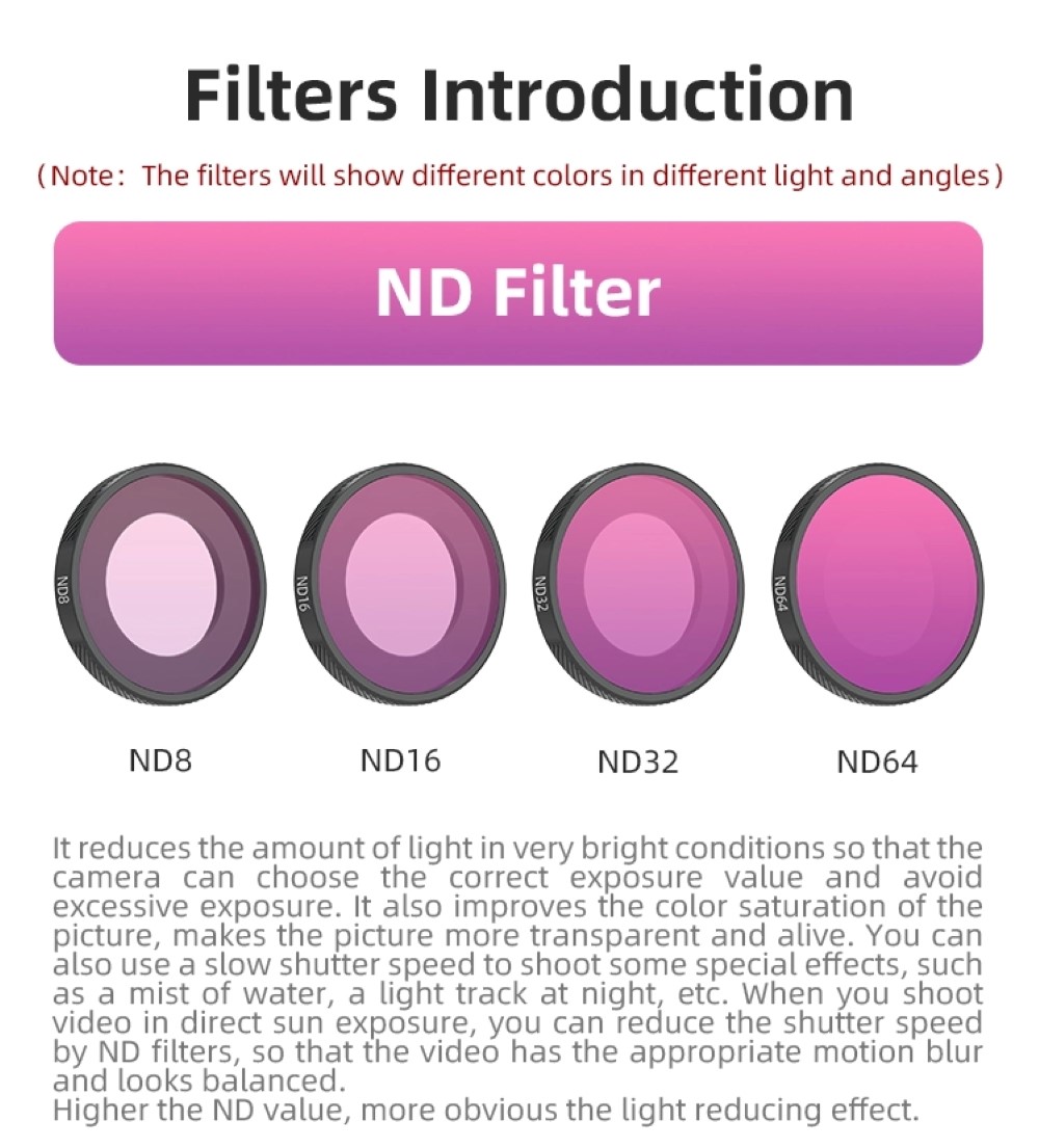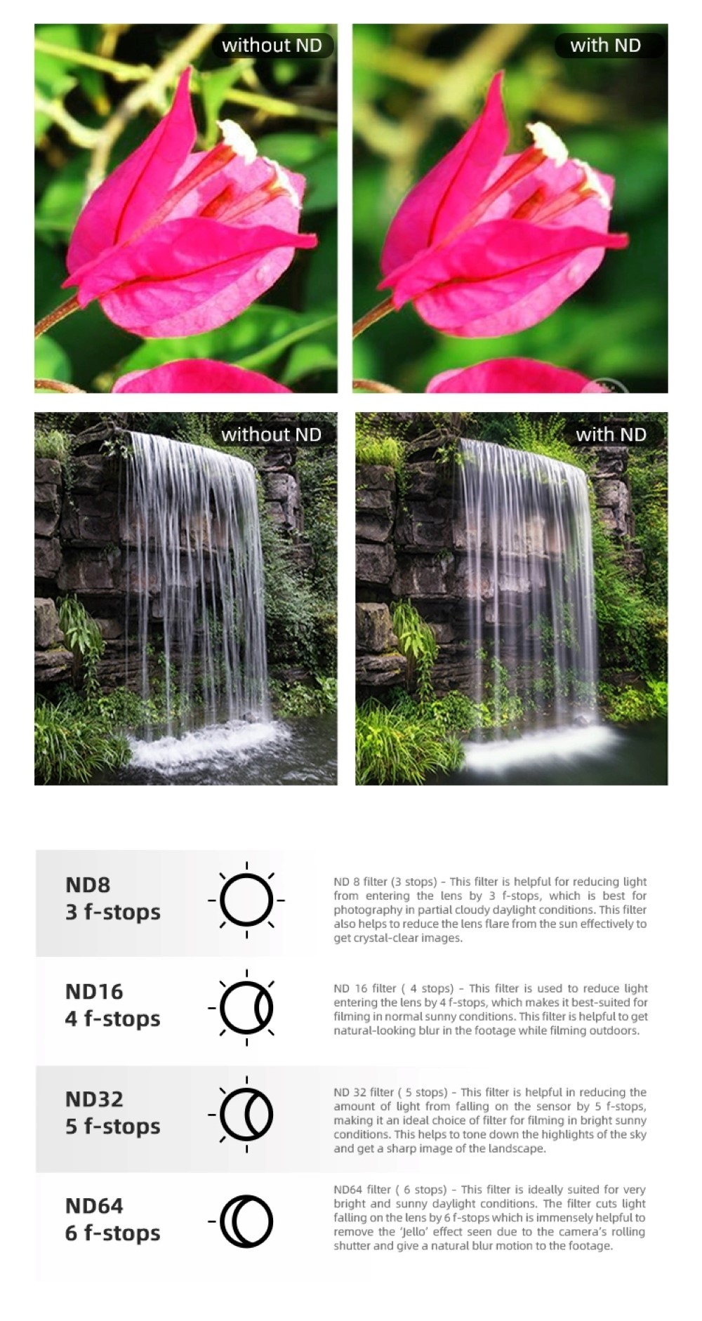 Cinematic exposure control: ND filters reduce light intensity for smoother videos and sharper photos.