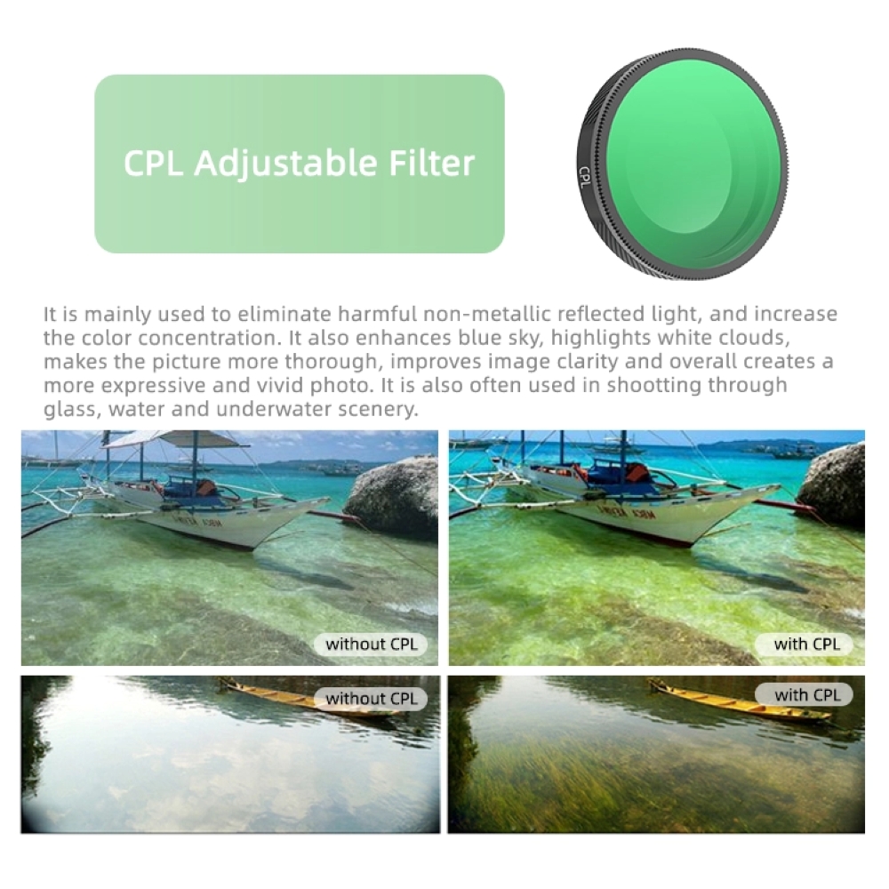 Polarizing effect: CPL filter minimizes glare from water, glass, and reflective surfaces.
