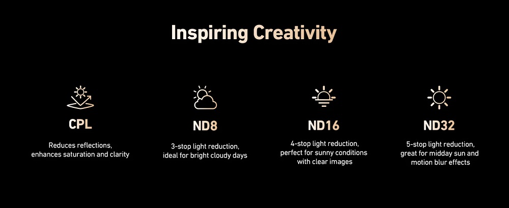 - CPL + ND8/ND16/ND32 Filters: Control glare, light exposure, and achieve cinematic motion blur.