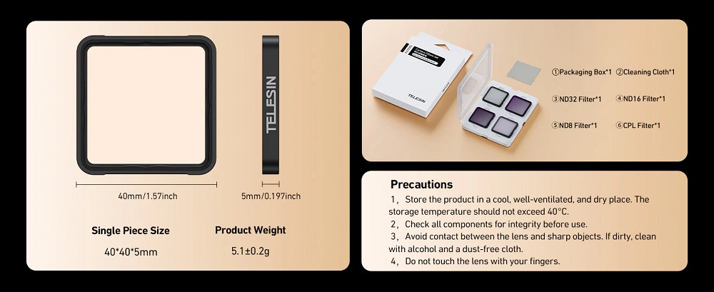 Enhance your Insta360 Ace Pro or Ace Pro 2 footage with the TELESIN CPL + ND8/16/32 Filter Set (S5-FLT-27-TIS). Each filter is crafted from premium optical glass with a rugged aluminum alloy frame and multi-layer coatings for water and oil resistance. The snap-on silicone clasp design allows quick filter changes, making it perfect for glare reduction, cinematic motion blur, and capturing vibrant landscapes with professional clarity.