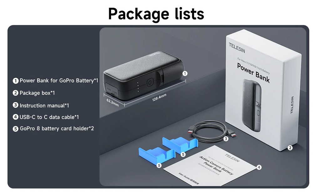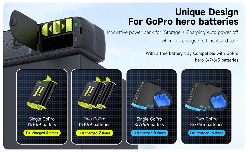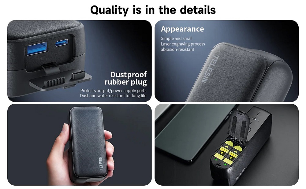 Charge and power your adventures anywhere with the Telesin GP-PB-001 – a 10000mAh power bank and dual charging box designed specifically for GoPro users. Built tough for creators on the move. alike.