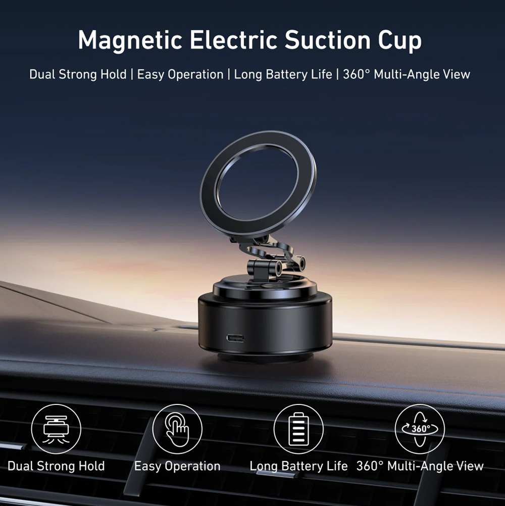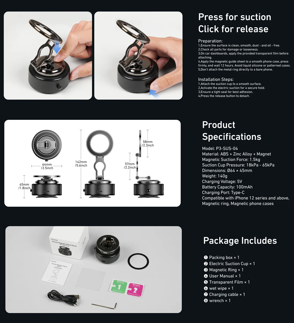 electric vacuum phone mount, magnetic phone holder, foldable suction phone stand, telesin p3-sus-04, 360 degree rotatable phone mount, strong magnetic phone mount, aluminum abs phone holder, usb-c rechargeable phone mount, travel phone accessory, hands free phone mount