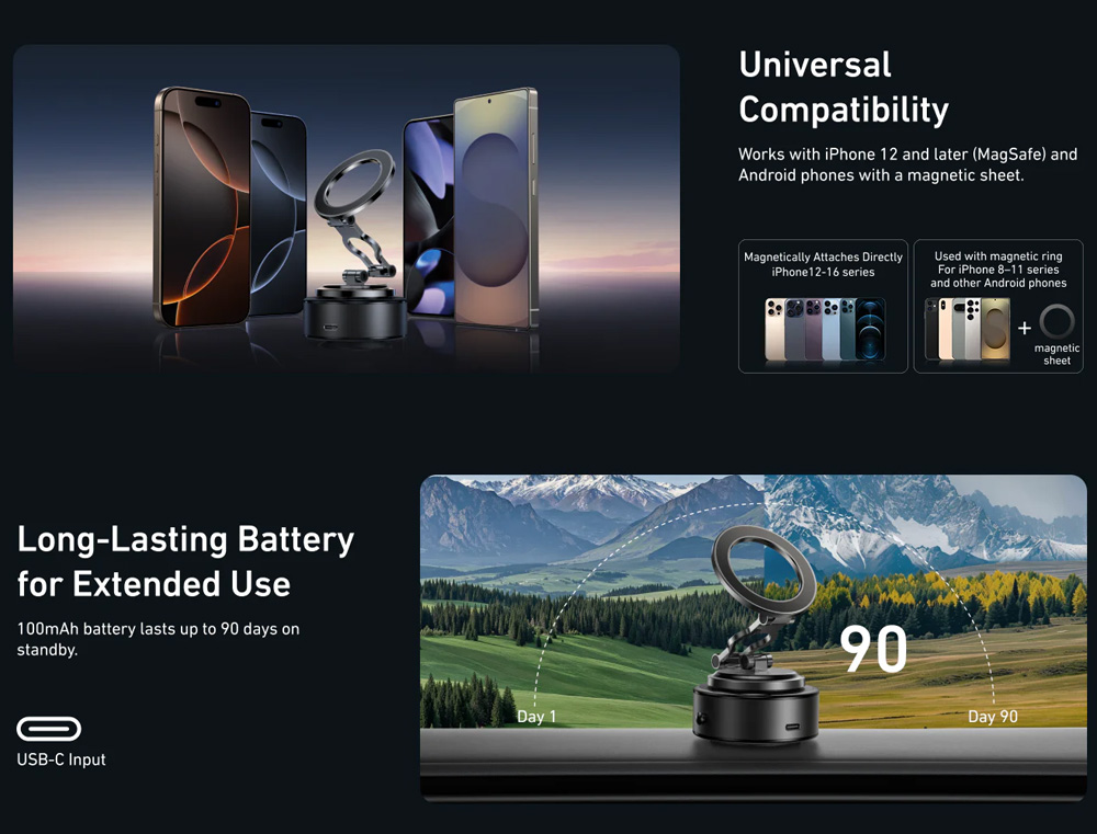 - Universal Compatibility: Works with iPhone 12–16 series or any phone with magnetic ring.