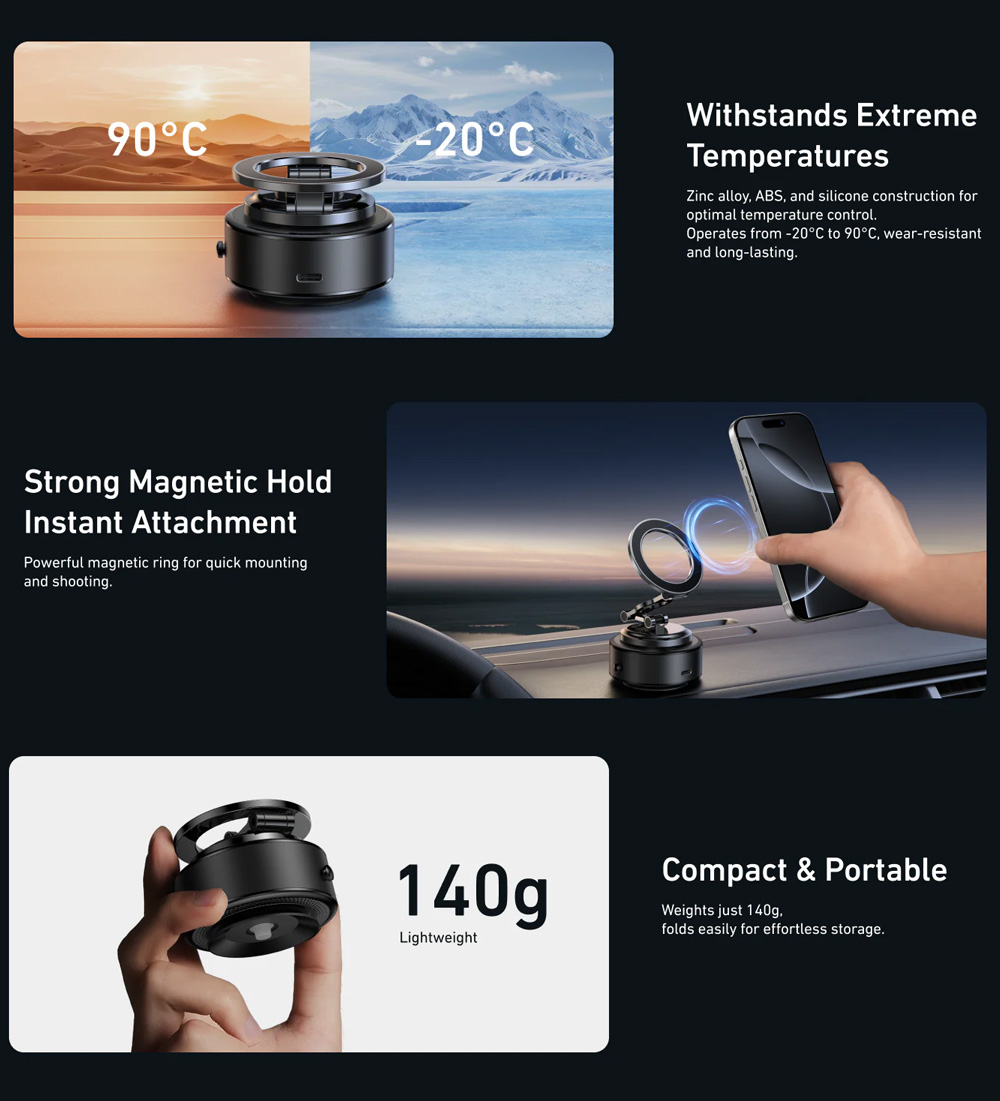 Enjoy reliable hands-free support with the TELESIN Electric Vacuum Magnetic Phone Mount (P3-SUS-04). Built with ABS plastic, aluminum alloy, and strong magnets, this mount features a powerful electric suction base for rock-solid grip. Its 360° rotation and 180° tilt provide flexible viewing, while the foldable design makes it portable and travel-friendly. With USB-C charging and long standby life, it’s perfect for driving, filming, or streaming anywhere.