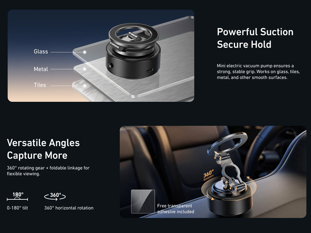 - Electric Vacuum Suction Base: Provides strong grip on smooth surfaces with secure hold.