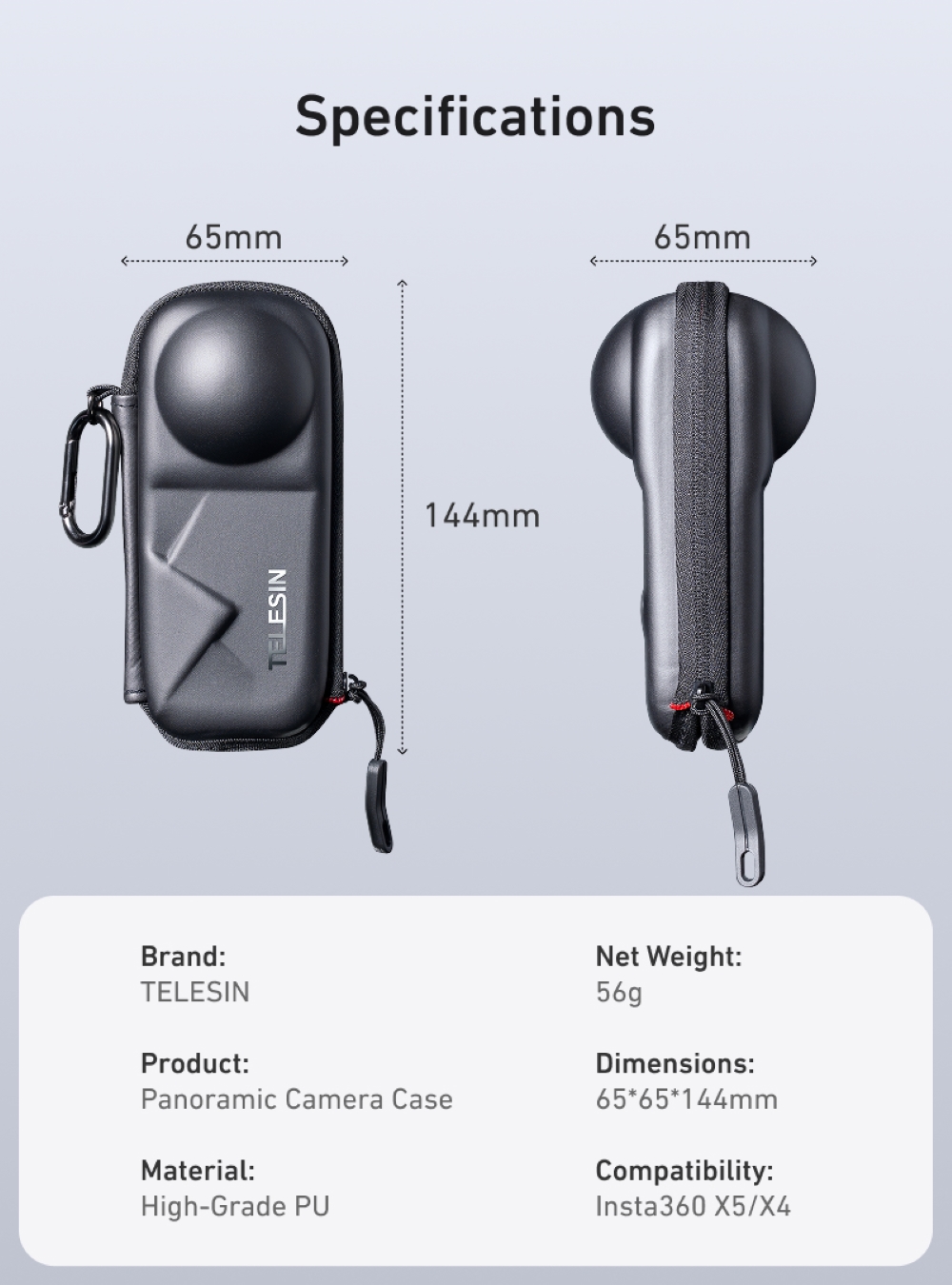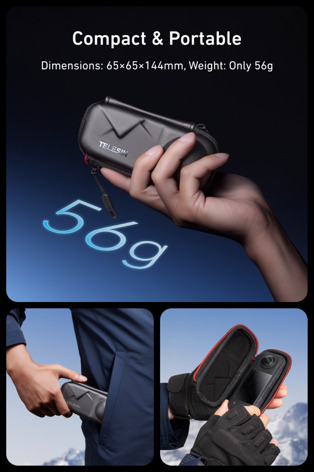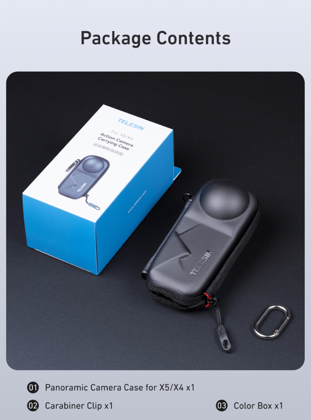 Telesin Mounting Portable Semi-Open Zipper EVA Bag w/ Carabiner for Insta360 X5, X4 Cameras S6-PRC-19-TIS